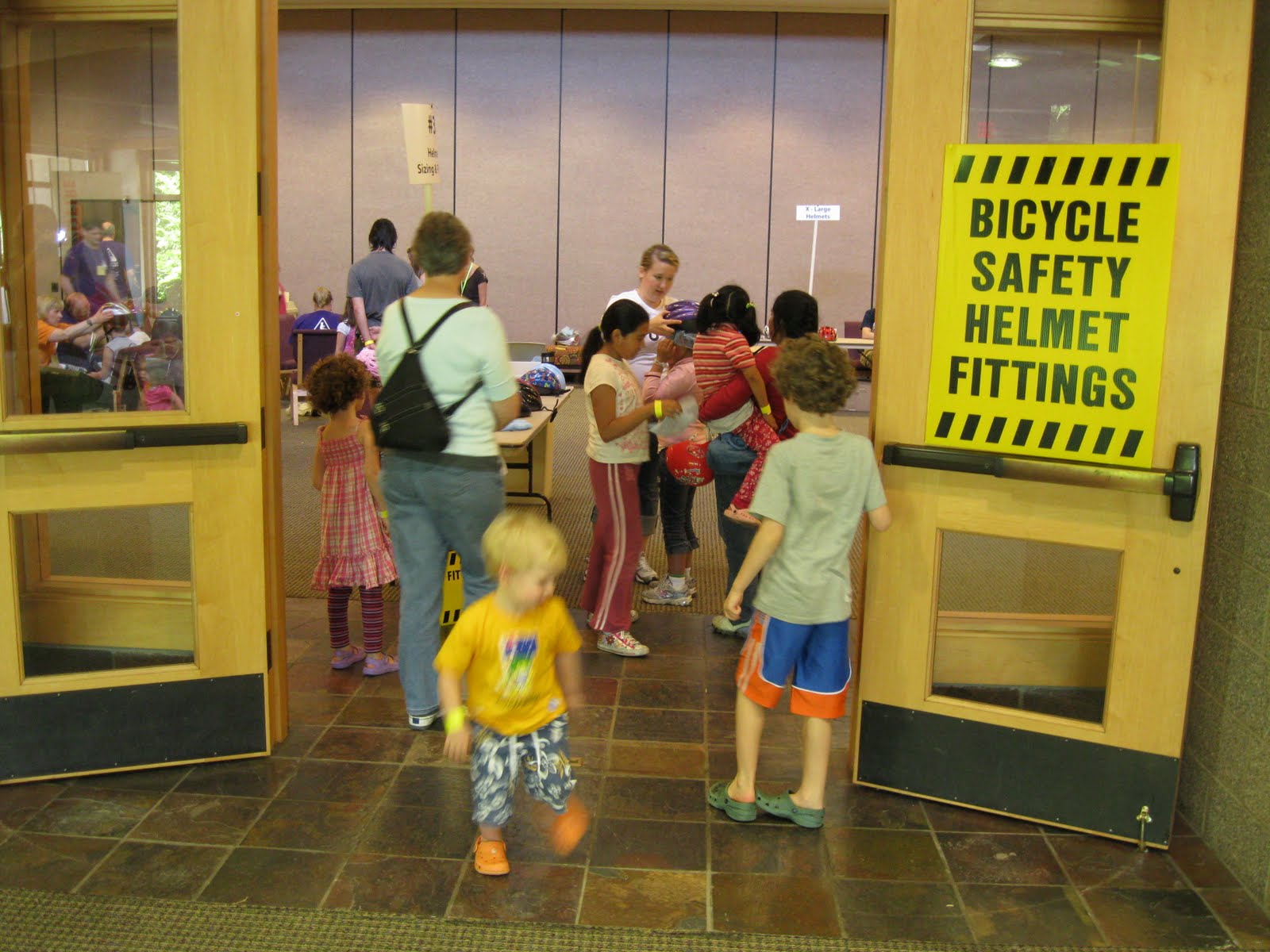 My mom had picked up a flier for a cheap bike helmet event at a local church, so we headed over. It turned out to be a completely awesome family bike safety event. There was a bike clinic outside where bike mechanics were doing free tuneups. There was a bike course set up for riding. I didn't realise all of that was happening, so we didn't bring our bikes. We headed inside for the $5 helmets.